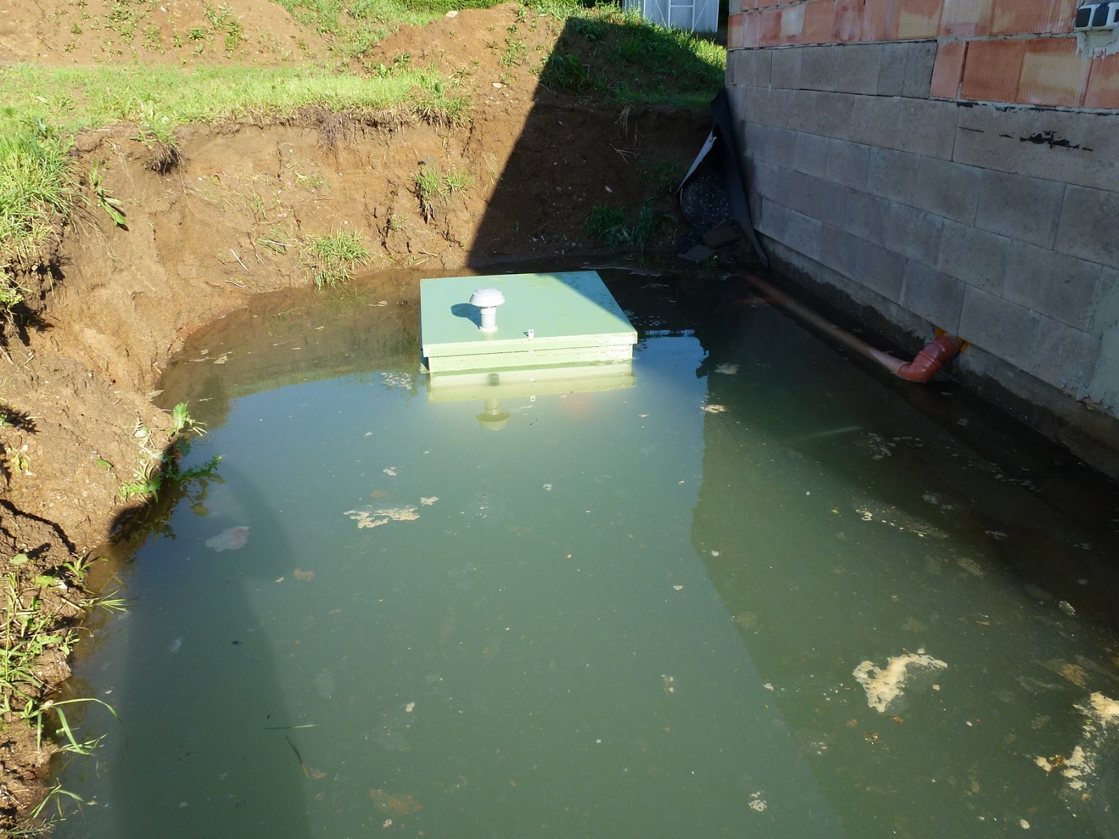 Tentokrát se tedy voda neobjevila nikde v domě, ale díky těm velkým děšťům způsobujícím všude vodní spoušť, se ani naše lokalita nevyhla "velké vodě". A to jsme prosím pěkně na kopci...teda technicky vzato spíše trošku pod tím nenápadným vrcholem...A i to bylo jednou z příčin, proč se nám během vytrvalého deště začala stahovat voda do výkopu k domácí čistírně. To, že už tam máme bazén pro dvě pěkně rostlé sloní samice jsme nezjisili hned, ale až když nám soused poslal fotku na část naší ulice. Ze snímku bylo jasné, že ani výkop s čistírnou nebude ušetřen. Čerpání vody vůbec ničemu nepomáhá...přítoky z puklin ve stěnách výkopu, ale i malé stružky obtékající dům a spojující se v nejnižším místě vytrvale napájejí toto umělé vodní dílo. A naše dílo a voda z dalších parcel zase napájejí "jezero" v zatáčce příjezdové cesty.